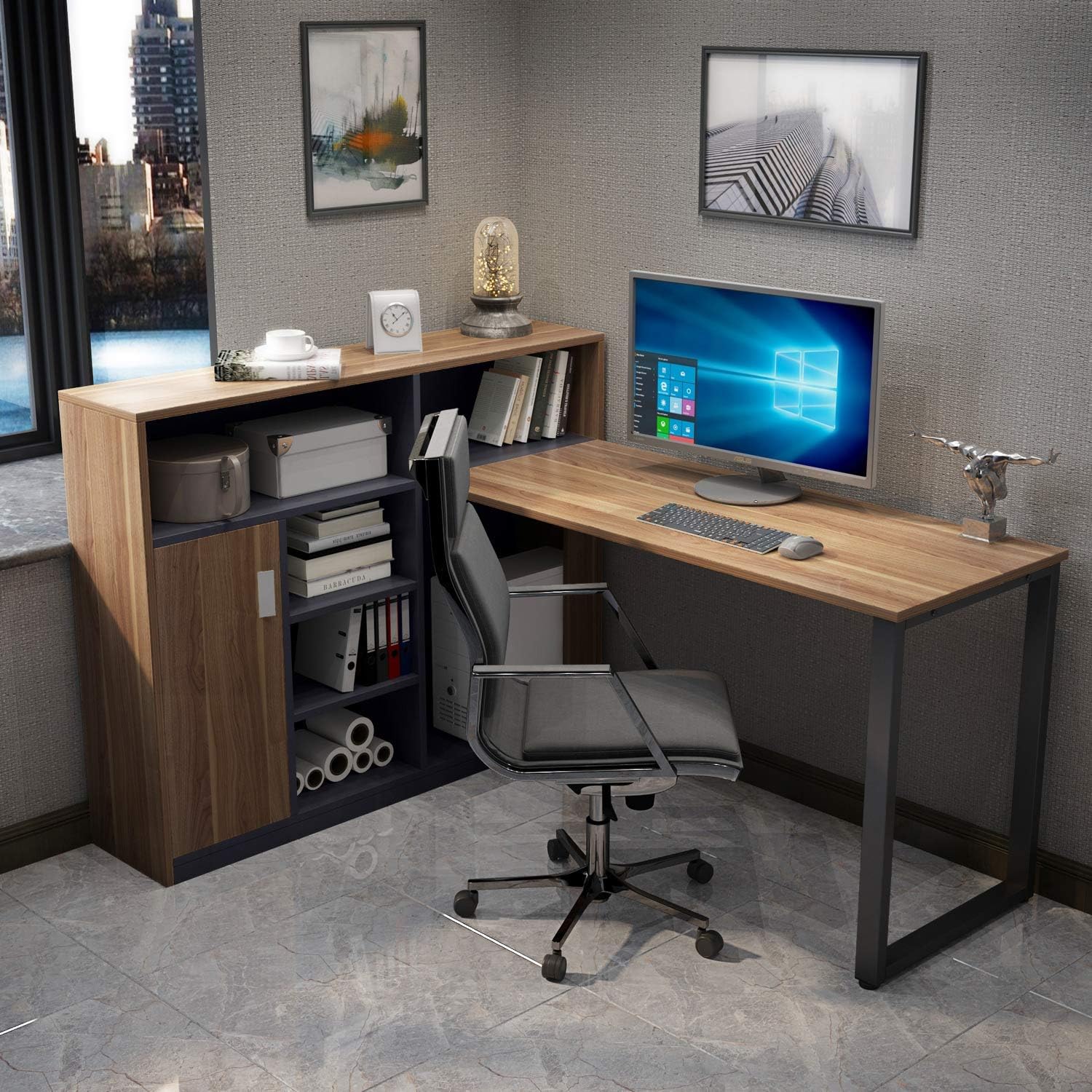 Modern Home Office Desk With Cabinet And Bookshelf Tribesign 59 Inch Large Computer Desk With Storage L Shaped Corner Desk Computer Workstation With Hutch And Tower Shelf Furniture Sets Office Products
